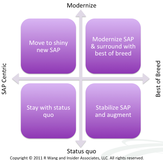 SAP still plays a significant role in the apps landscape for most organizations. However, the days of an all SAP or nothing environment are coming to an end. Business leaders suffering under the wrath of an SAP CIO have taken matters into their own hands and voted by choosing SaaS options for their business units. Constellation recommends that organizations take a pragmatic not dogmatic approach to optimization the SAP investment.