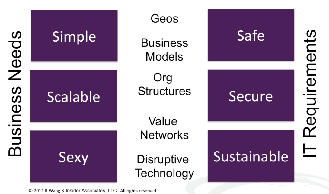 The recent Harvard Business Review post titled, "Coming to Terms with the Consumerization of IT" (CoIT), identifies six factors for the basis of balancing enterprise class requirements. Success requires a natural equilibrium between business needs and IT requirements as evidenced (see Figure 1).