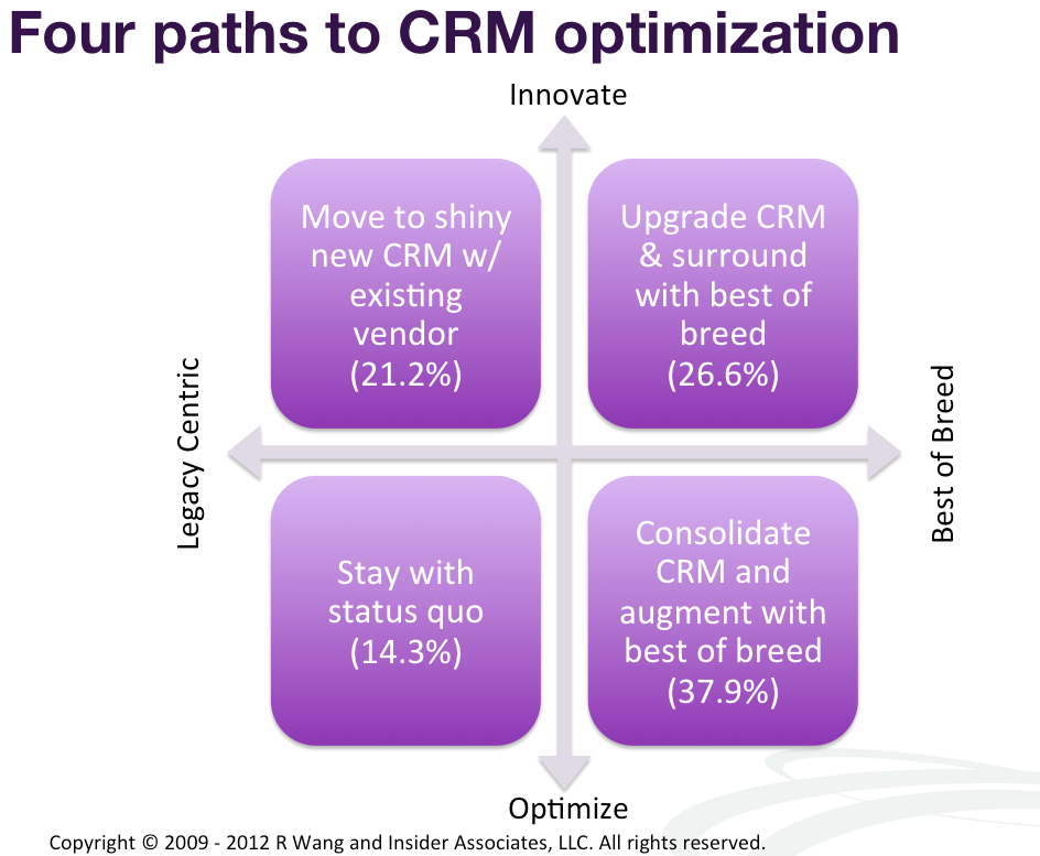 - Stay with status quo (14.3 percent). Organizations may choose to continue business as usual. The catalysts for change include major events such as new business models, merger and acquisition, or regulatory requirements. Status quo includes keeping the system as is. Most organizations in this category have either really good adoption or overbought and barely take advantage of existing capabilities. Backers of the status quo scenario find little business value justification and line of business support in making any changes. Many line of business executives and CIOs gain peace of mind knowing that their CRM landscape remains consolidated on one or two platforms and can deliver the power of an integrated core.