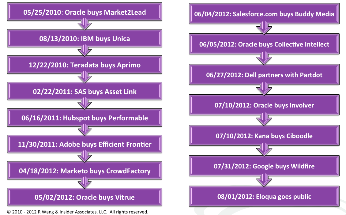 Why the change? Marketing sits at the cross roads between the old analog world and the new shift to digital transformation. With each big shift, organizations will change what technologies they invest in, who they decide to partner with, and how quickly they will make the shift. This new battle for CMO mind share started when IBM purchased Unica for $480M in August 13, 2010 (Figure 2). The frenzied activity by Adobe, Dell, Eloqua, Google, Hubspot, Kana, Marketo, Oracle, Salesforce.com, and SAS Institute reflect the desire to be top of mind among CMO budgets.