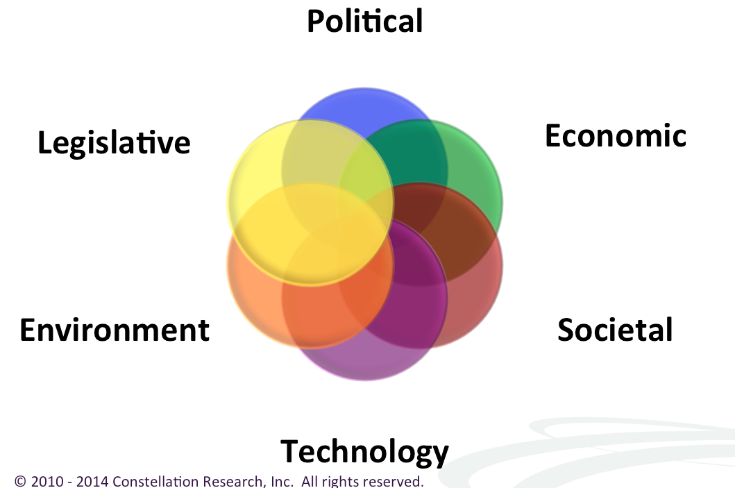 The strategic assumptions from Constellation’s 2014 PESTEL framework form the basis for the business theme-led research. Over the next 36 months, research from each business theme will factor these trends into the overall research agenda. The goal in 2014 is to help clients not only navigate, but also dominate digital disruption.