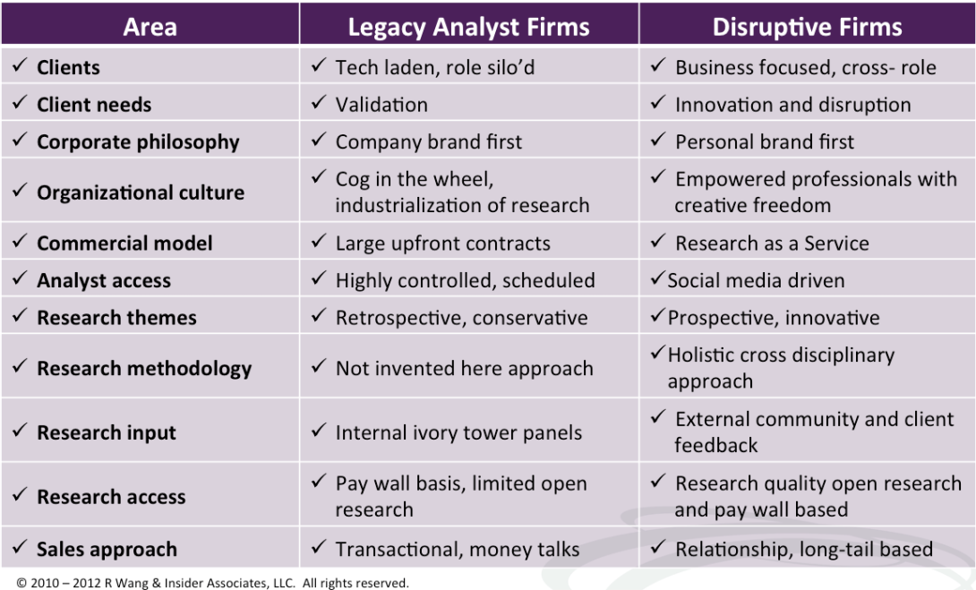 - Information often confused as insight. Many legacy analysts have precious little fresh insight of their own. Often legacy analysts operate on limited data and base “facts” from old surveys run at the corporate level. The result - dated insight not grounded with the reality of the buyer’s point of view. In fact, many have become so enslaved to the vendor evaluation model and have forgotten that they really are an analyst who’s supposed to provide insight to the world - not simply regurgitate vendor-fed marketing hype.