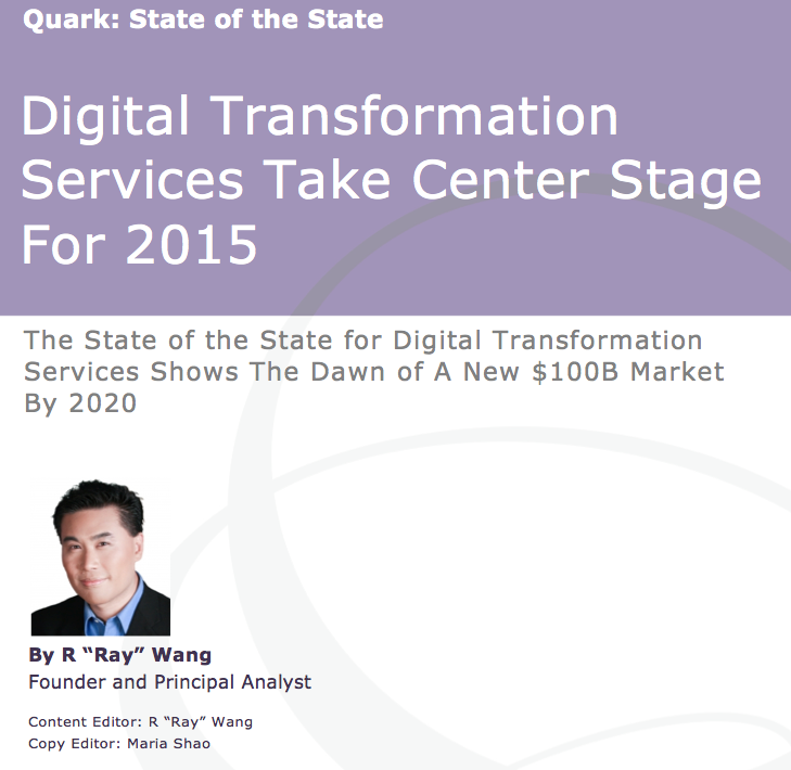 The latest Constellation Research state of the state report explores the impact of digital transformation on the services front. As so many different pieces of the digital transformation space come together, Constellation believes that the Digital Transformation Services category is set to explode in 2015, and we forecast it to surpass $100.7B in 2020.