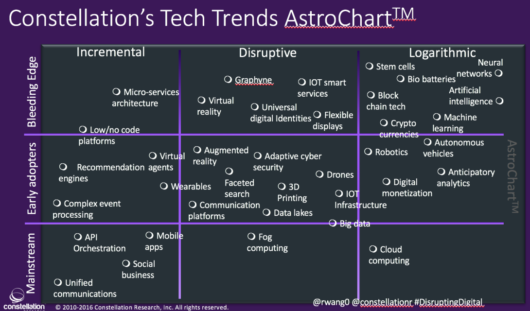 Constellation's AstroChartTM for Technology provides market leaders and fast followers a visual guide to technology trends and their adoption. The vertical access rates adoption from mainstream to early adopters to bleeding edge. The horizontal access estimates the impact on an organization's business model. from incremental to disruptive to logarithmic. The intent of an AstroChartTM is to move beyond both the hype and constraints of a 2 x 2 grid.