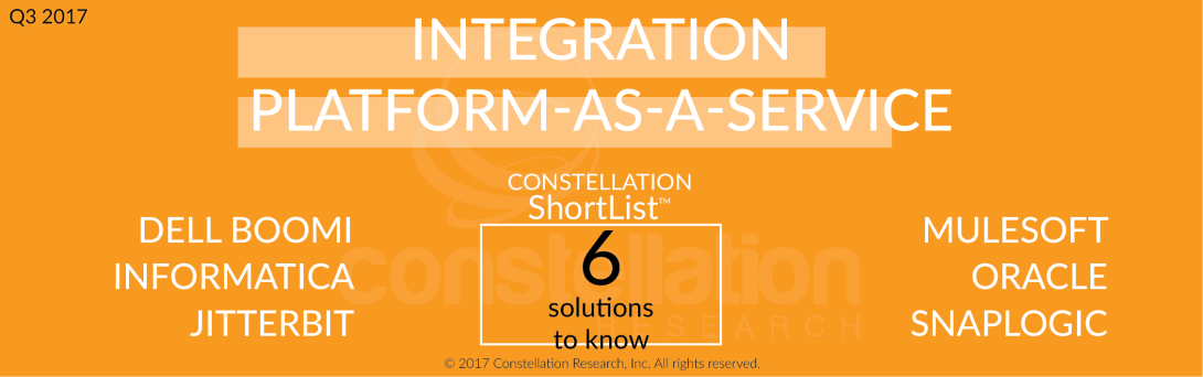 Constellation Research estimates that by 2020, at least 60 percent of the data that the average organization considers to be mission-critical will live outside of the corporate firewall. Against this backdrop, the Integration Platform as a Service (IPaaS) is emerging as a one-stop, cloud-based choice for supporting both data and application integration. It helps companies integrate SaaS applications with other SaaS applications, SaaS applications with on-premises applications and cloud- based data with on-premises data. It also supports data- monetization scenarios, whereby data and insight pipelines serve multiple destinations.